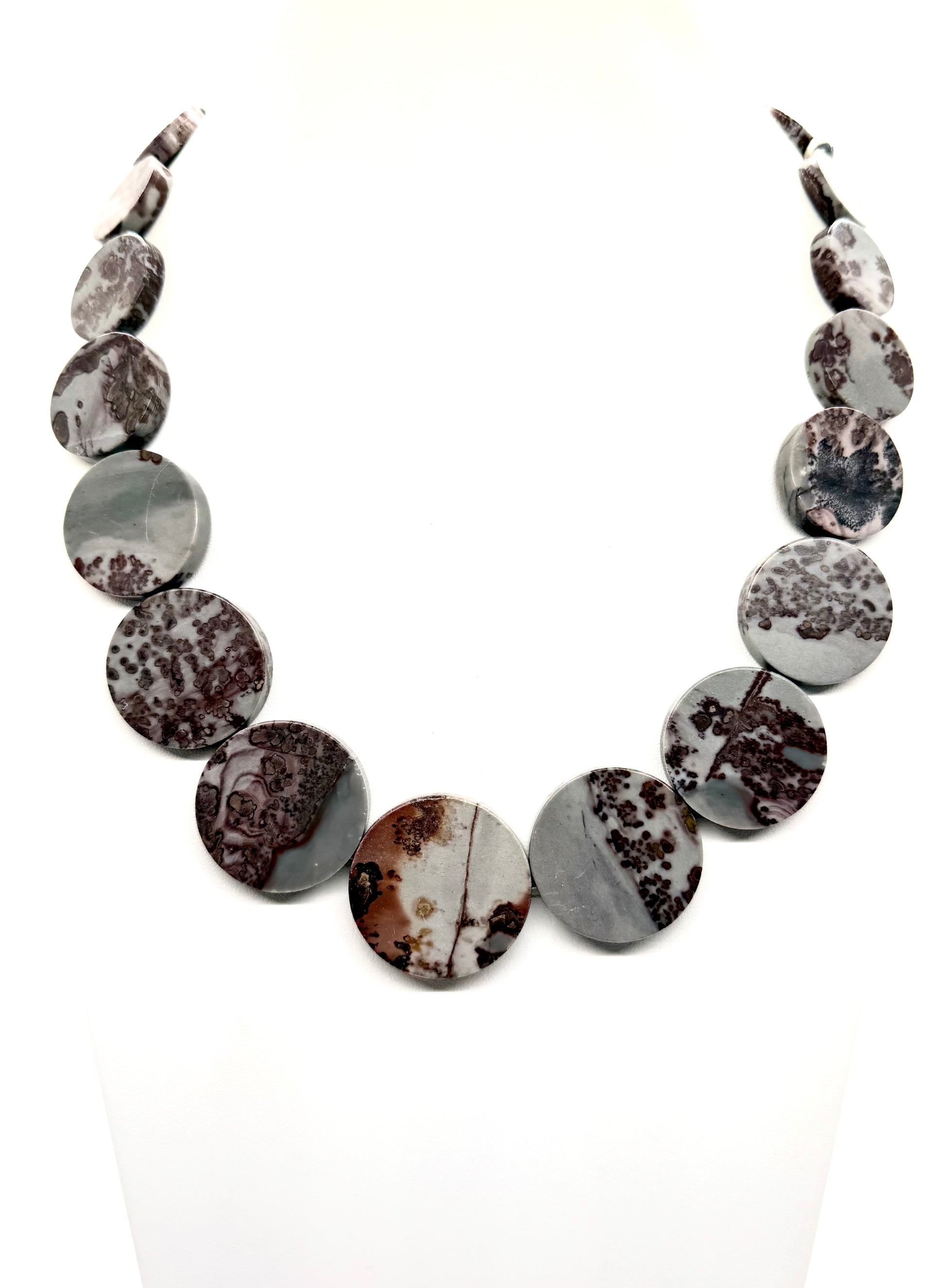 Smooth graduated round shaped Jasper beads pair with oxidized sterling silver Navajo Pearls. Finished length of necklace is 21 inches.