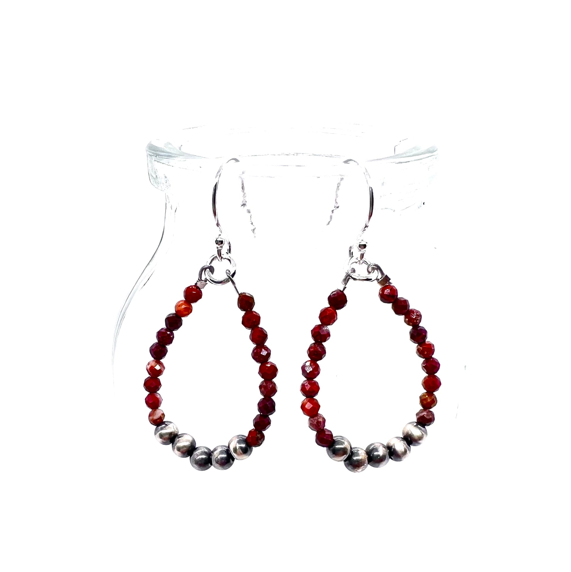 Petite faceted brecciated red jasper beads pair with oxidized sterling silver Navajo Pearls. Finished length with sterling silver ear wire is 3.5 centimeters.